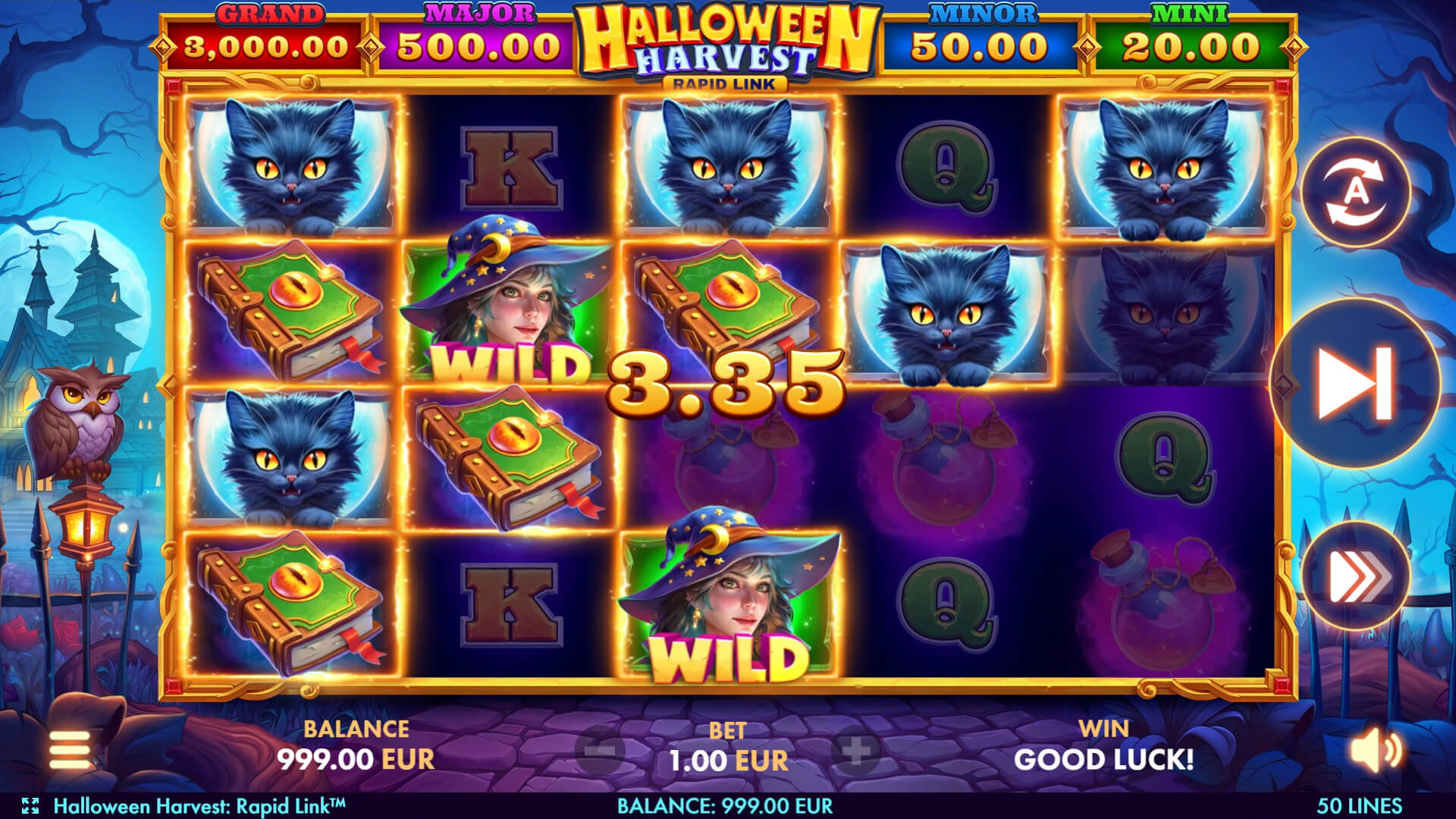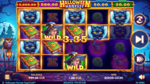 The Halloween Harvest: Rapid Link slot comes with 5 reels, 4 rows, and 50 lines. While you play, hoping to see the WILD Witch again, also enjoy the background with moving elements, eerie music, and high-quality graphics. Don't forget, the witch is always accompanied by her loyal friend, the black cat. Perhaps he will give you a hint about where the treasures are hidden. All symbols are rendered in exquisite detail and will help create a harmonious and captivating atmosphere.