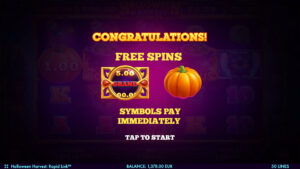 3 witch cauldrons hold spells that bring Free Spins and don't forget about the Rapid Link Bonus! This time a mystic 9th row appears by collecting the required number of Pumpkins and Rapid Roll Symbols.