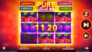 Pure Luck 27: Classic$$erieS captures the essence of traditional fruit slots with a lively, colorful design and fast-paced gameplay. Set against a radiant red-and-orange backdrop, the reels are filled with classic symbols like lemons, watermelons, grapes, and cherries - each spin bursting with nostalgic charm and vibrant energy.