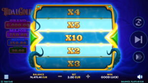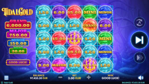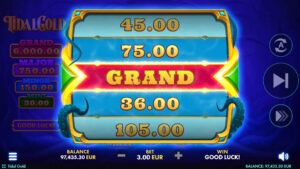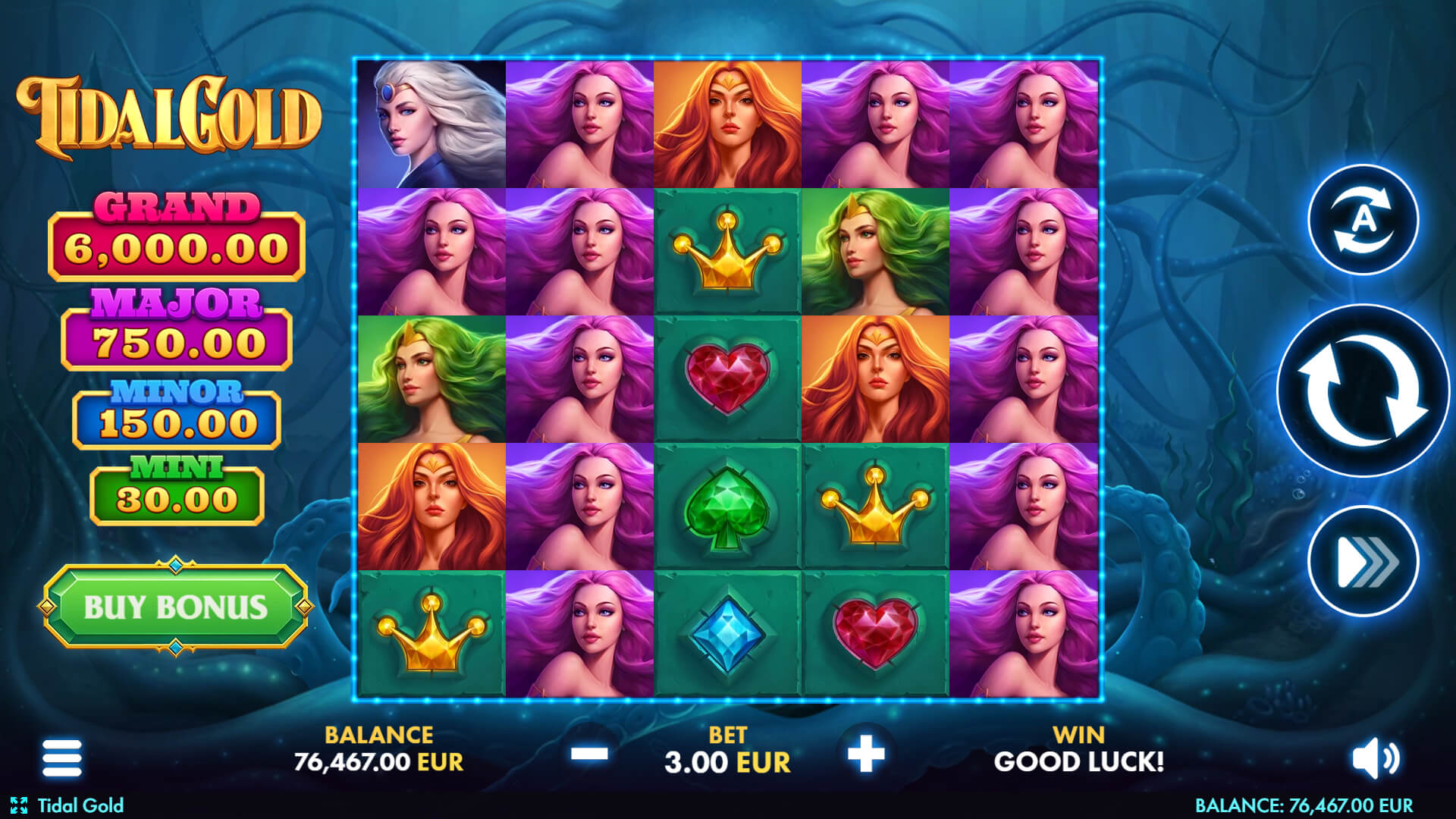 To the left of the reels, four jackpots - Grand, Major, Minor, and Mini - stand ready to reward lucky spins with impressive prizes. A Buy Bonus option adds extra excitement, giving players quicker access to special features and bigger opportunities.